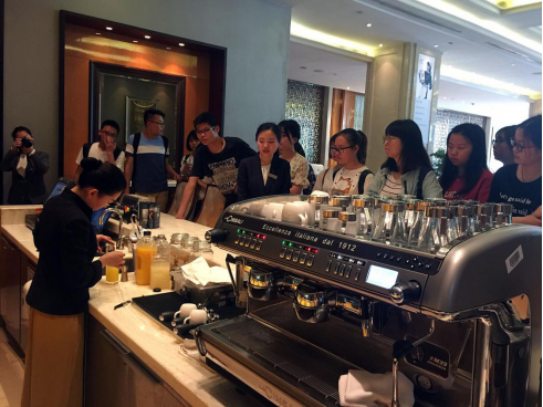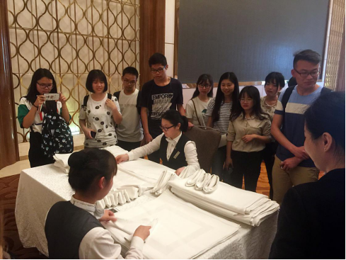 到达酒店后,酒店人力资源部总监向同学们详细的介绍了汉口泛海喜来登大酒店的部门构成、各楼层分布、客房类型等,让同学们对酒店的基本情况有了更加深刻的了解。接下来,在人力资源部同事的带领下,同学们带着神秘任务开始了“登登探索之旅”。同学们依次参观了酒店的宴会厅、中餐厅、西餐厅、泰餐厅、大堂吧、客房、行政酒廊以及酒店后区,每到一处大家都会认真拍照并记录下来,对于酒店的一切都感到新奇而兴奋。参观完毕后,酒店工作人员举行了一场酒店知识技能极速挑战赛,挑战项目是餐桌摆台、折叠口布、奶昔制作、调制鸡尾酒酒店产品知识问答等等,随着神秘任务的一一揭开,每个小组的同学们都开始了极速挑战赛的任务。通过此次任务的完成,同学们在增长知识的同时,也展示了团结协作能力,优胜队伍还获得到了酒店提供的精美小礼品。