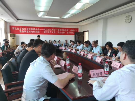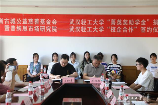 金秋九月,丹桂飘香,是硕果累累的季节,也是感恩的季节。在这美好日子里,湖北省古城公益慈善基金会“菁英奖助学金”捐赠仪式暨武汉普纳思校企合作签约仪式于2019年9月20日下午在raybet雷竞技下载常青校区行政楼第四会议室隆重举行。出席本次仪式的有湖北省古城公益慈善基金会陈斌理事长、刘骛宇秘书长、姚兆女监事长及基金会理事唐君先生、李迪先生、郭大鹏先生;武汉普纳思市场研究院杨林庚院长、证券部江波总监及运营部相关人员。我校党委副书记刘丰林,校友工作与合作发展办公室主任滕红华、科技处、财务处、宣传部等相关负责领导同志、经管学院党政领导及师生代表。国泰君安证券股份有限公司武汉紫阳东路证券营业部总监米亚昆、戈明耀出席了捐赠仪式。捐赠仪式由经管学院党委书记肖波明主持。