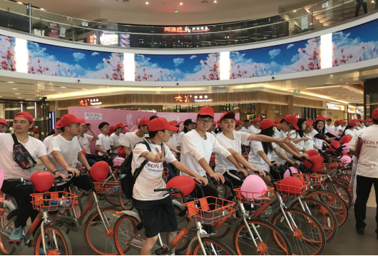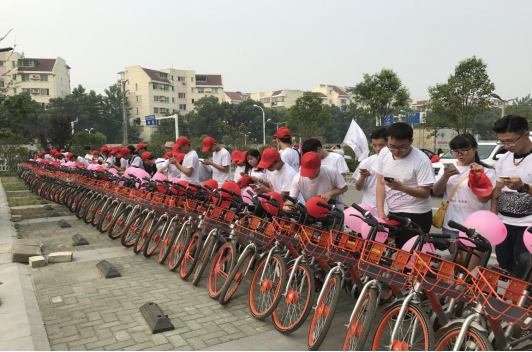 上午8:30点阳光明媚,同学们来到集合地,在学生会主席杨超和工作人员的协助下,同学们的服装、帽子摩拜单车、饮用水等装备一一准备妥当上午9:00整,工作人员一声令下,同学们排成一字长龙按路线有序骑行