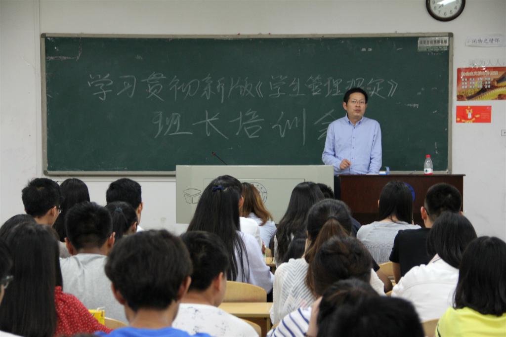 会上,孟三爱副书记主要从修改的目的、意义,主要条款及其变化,同学们如何学、如何做等方面,带领班长们对新版《学生管理规定》进行了认真学习。随后,他还从有心眼、有口才、有粉丝、有方法等方面谈了如何当好班长;并要求班长们在国庆节前组织好各班的学习讨论活动;同时要以身作则、分工负责、加强值班,维护好国庆中秋节日期间各班同学的安全。