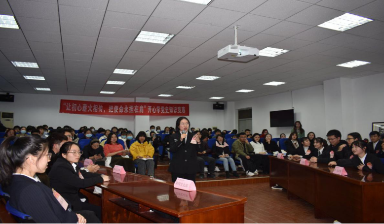 比赛结束,廖前兰对本次活动作了精彩的总结,她说:“今天这个活动举办的非常有意义有意思,活动内容丰富,形式新颖,不愧为一次‘开心’学党史。”鼓励我们师生以后要多举办类似活动,为同学们提供更多学习、交流和展示的舞台,同时,更希望同学们能感悟本次活动的举办意义,不忘初心,践行使命。在颁奖仪式前,学生第一党支部书记陈星园老师带领支部全体党员学生带来了精彩的诗朗诵以及合唱《强国一代有我在》歌曲表演。现场掌声不断,气氛热烈。