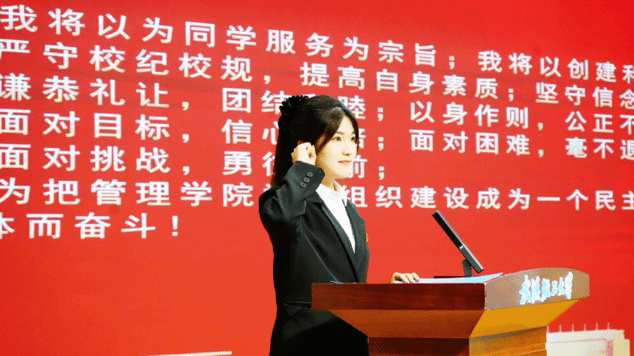 述职环节中,学生会王晓楠、青年志愿者协会汪斯琪、新媒体中心万俊怡作为学生组织代表,先后围绕部门基本情况、工作总结和未来展望进行阐述,并表示将坚持以思想促行动,不忘初心,为管院发展不断增添活力。随后,志愿者代表周璇在发言中分享来到大学后的成长感悟,坚持将“奉献、友爱、互助、进步”的志愿精神转化到实践中,呼吁每一位组织成员以行动证明担当,以实干书写青春。